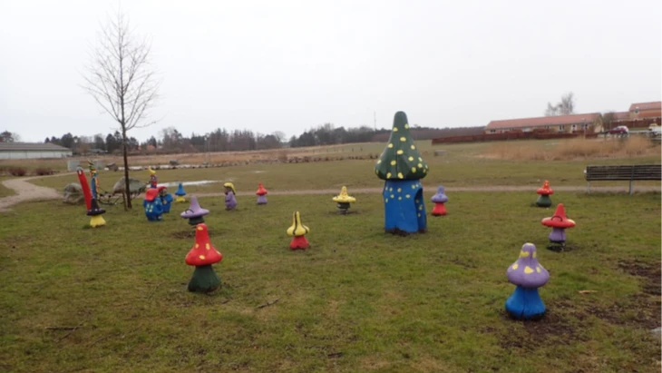 Legeområdet er en lille åben Paddehatte-landsby, inspireret af naturen både i valg af materialer og udformninger. De sjove små alfer forestiller paddehatte, og de er alle malet i sjove farver. Der er desuden klatrenet og vippedyr på legeområdet, som ligger ved siden af et lille hyggeligt bålsted.