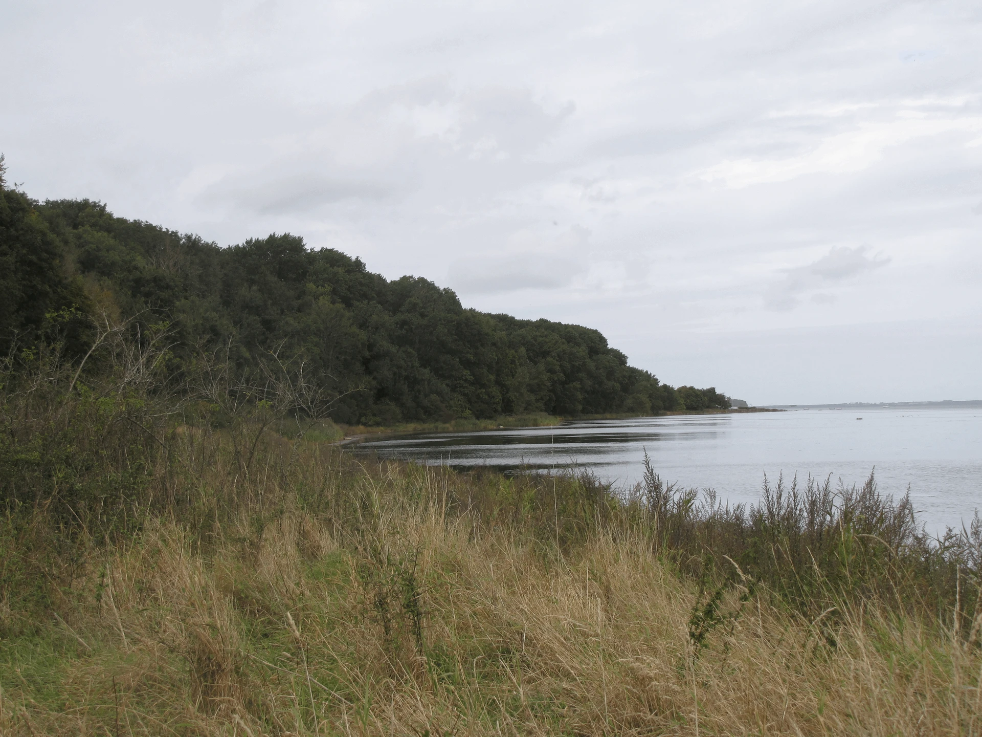 Kystskoven ud til Isefjorden når helt ud til vandkanten, hvor enkelte træer er væltet ud over kysten som følge af erosion under storme fra nord.