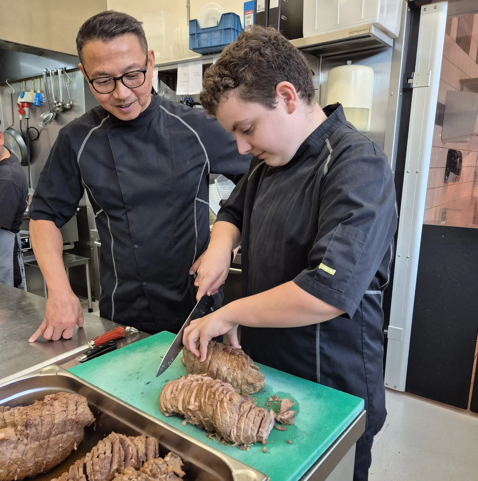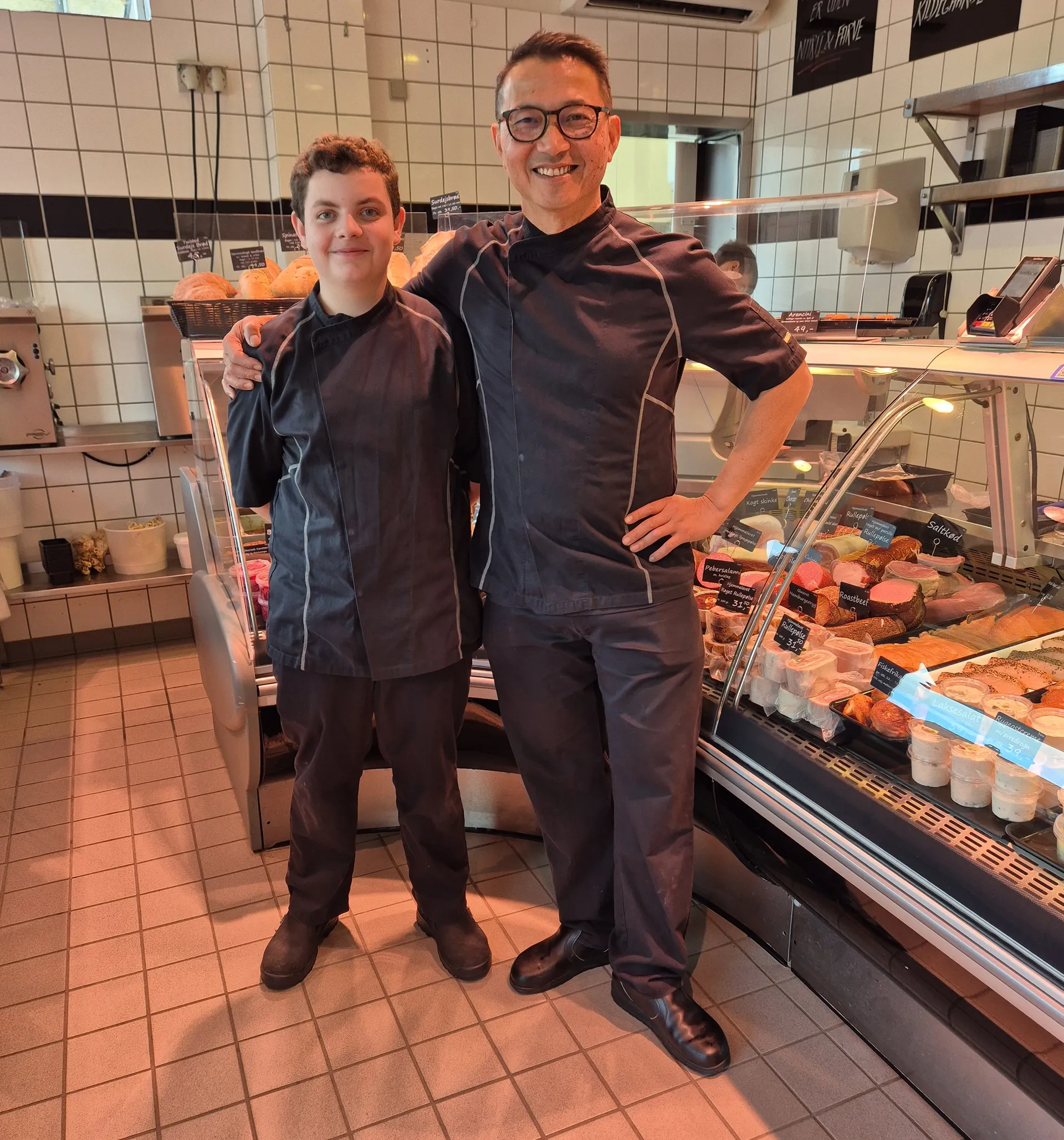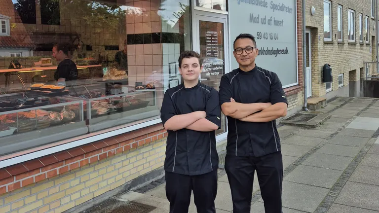 Det er tydeligt, at de to kan lide hinanden - Jai, den erfarne slagtermester og indehaver af Munkholmslagteren og Mads på femten, der er i juniormesterlære hos slagteren.