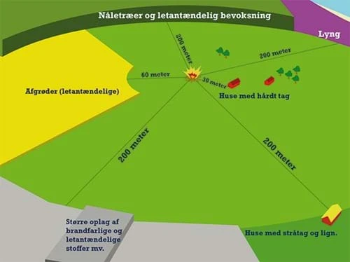 - 200 meter fra stråtækte huse og andet let antændeligt materiale