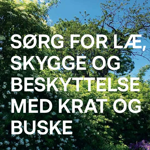 - Plant hjemmehørende træer og buske – fx tørst, vedbend og mirabel. De giver både mad og skjul.