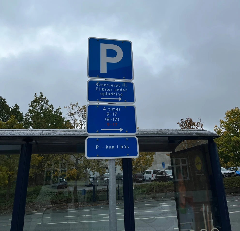 Vær opmærksom på, at dette skiltningen angiver, at parkeringspladserne er reserveret el-biler under opladning. De må derfor kun benyttes til standsning og parkering af el-biler under opladning. Det er ikke tilladt for andre typer biler at parkere her. Hvis du benytter på en plads reserveret til el-biler og ikke overholder reglerne for opladning og eller tidsbegrænsningen, kan det medføre en afgift på 510 kr.
