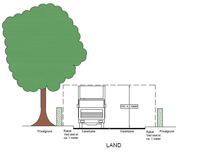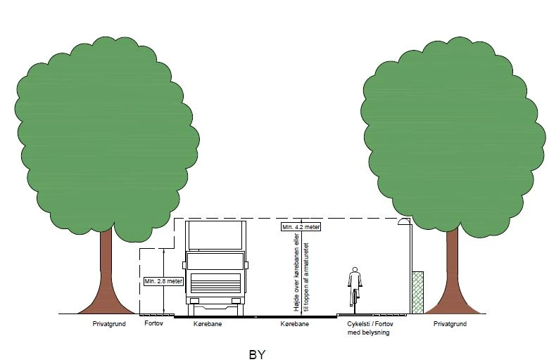 - Træer og buske bør være beskåret, så der altid er en frihøjde over fortove, cykelstier og rabatter på 2,8 meter og en frihøjde over kørebaner på 4,2 meter.